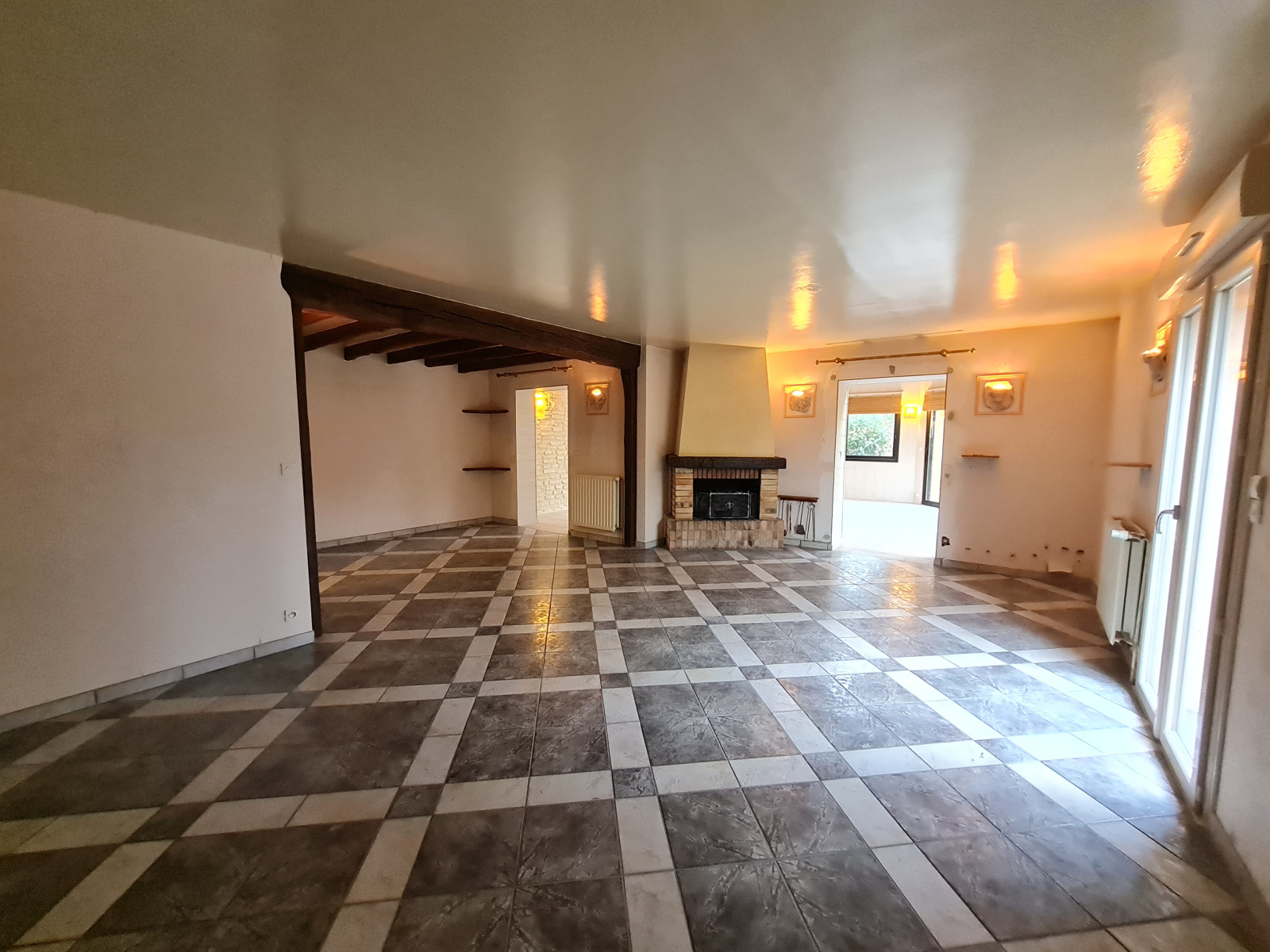 Une entrée distribuant un séjour de 40m² avec cheminée, un salon de 35m² lumineux avec un accés sur une terrasse, une cuisine aménagée semi équipée, un wc, une chambre de 14m² avec placard, une salle de bains.